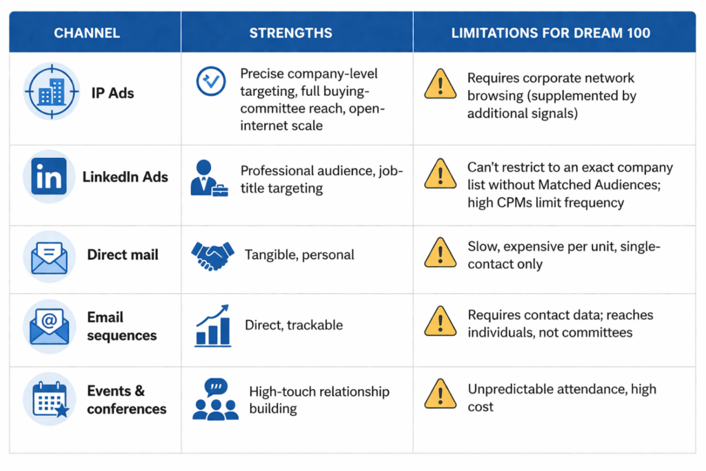 Most teams pursuing a Dream 100 strategy combine multiple channels. Here’s where IP ads fit alongside the alternatives.
