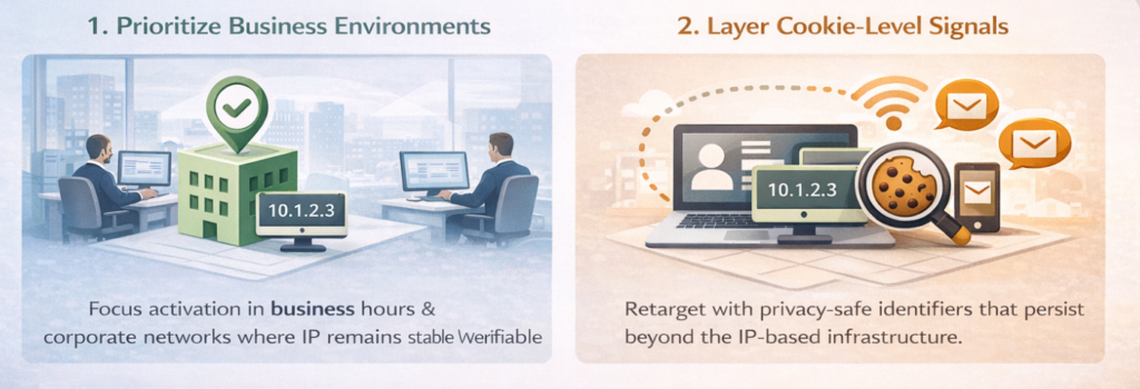 This is why large enterprises are so easy to reach with IP-based B2B advertising. Their networks behave like fixed addresses on the internet. When a DSP targets their IP ranges, it is genuinely targeting the company.
